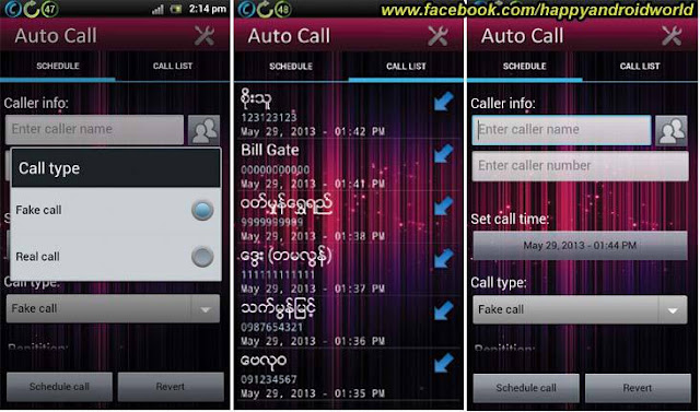 Auto Call က Fake call အတြက္ခ်ည္း မဟုတ္ပါဘူး။ Real Call အတြက္ Schedule ဆြဲၿပီး ေခၚဆိုႏိုင္ပါတယ္။ ခ်စ္ခ်စ္ရဲ႕ ေမြးေန႕မွာ ဖုန္းမေခၚမိမွာ စိုးရိမ္ရင္ အဲ့ေန႕မွာ ဘယ္အခ်ိန္ေခၚမယ္ဆိုၿပီး အခ်ိန္သတ္မွတ္ေပးလိုက္။ ခ်စ္ခ်စ္ေမြးေန႕မွာ သတ္မွတ္ခ်ိန္ေရာက္ရင္ Phone Call အစစ္ ေခၚပါ့မယ္။ Phone Call အစစ္ သတ္မွတ္ခ်ိန္မွာ ေခၚတဲ့အခါ ဖုန္းကေန အသံေပးၿပီး